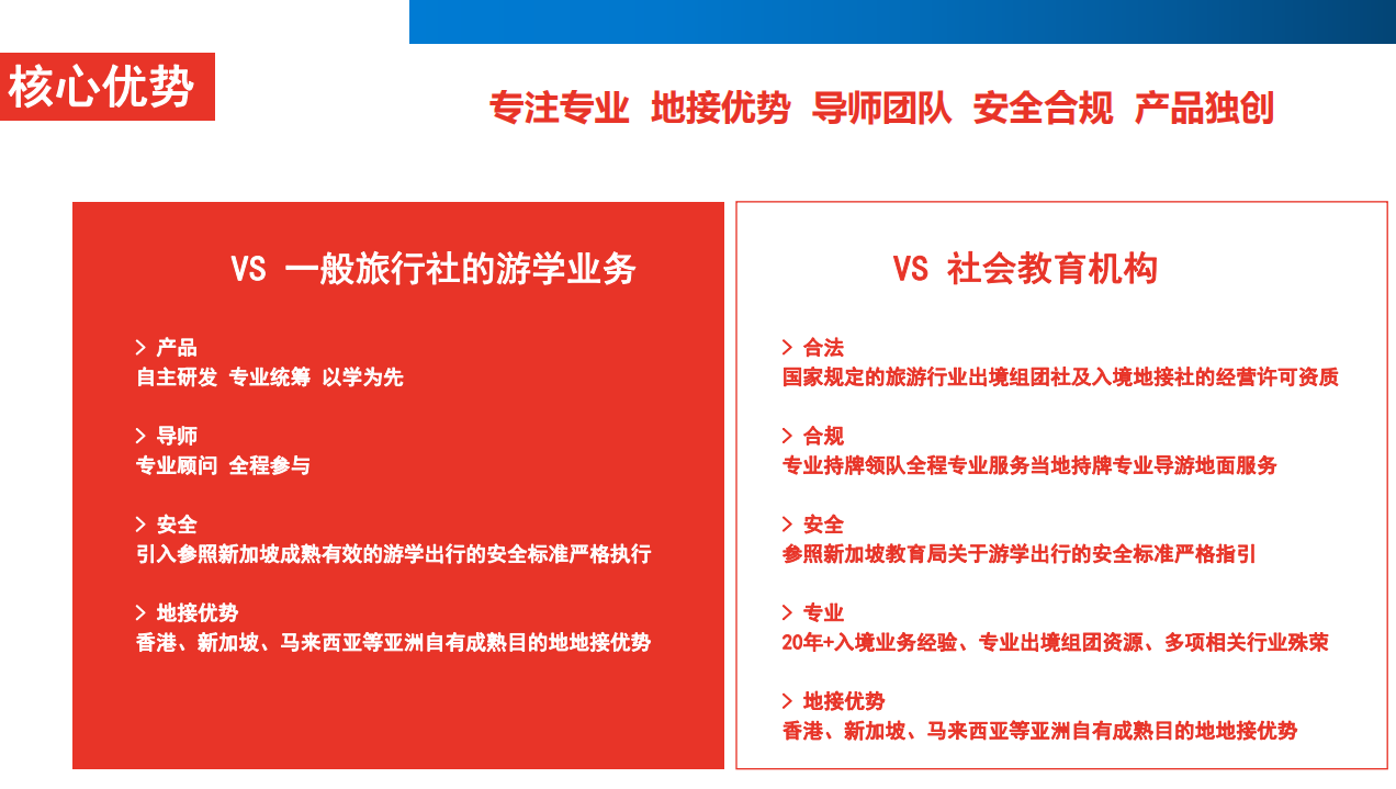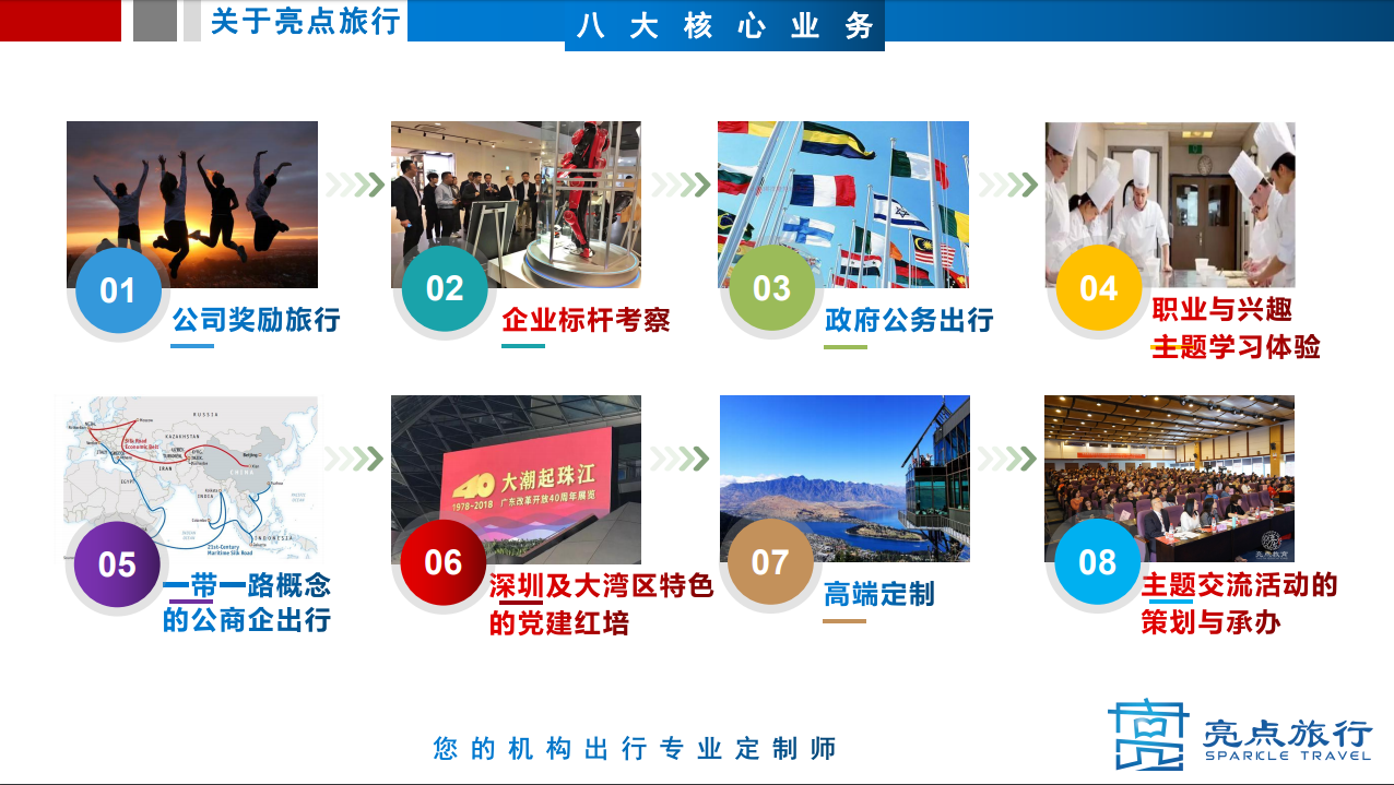深 圳 市 亮 點(diǎn) 國(guó) 際 旅 行 有 限 公 司 Sparkle Travel Service &MICE (Shenzhen) Co .,Ltd 深圳亮點(diǎn)國(guó)際旅行社有限公司是深圳世紀(jì)假日旅游集團(tuán)旗下獨(dú)立法人子公司,致力打造 專業(yè)定制品牌“亮點(diǎn)旅行”,專注成為政企機(jī)構(gòu)出行的專業(yè)定制師。 亮點(diǎn)國(guó)際擁有超過20年豐富行業(yè)經(jīng)驗(yàn)的創(chuàng)意策劃團(tuán)隊(duì)和高效的執(zhí)行團(tuán)隊(duì),累積多年的實(shí) 戰(zhàn)經(jīng)驗(yàn)和優(yōu)質(zhì)口碑,倚助集團(tuán)海外目的地地面公司的一手資源優(yōu)勢(shì),為政府及企業(yè)活動(dòng)出行提 供方案策劃/落地執(zhí)行/效果管理的優(yōu)質(zhì)一條龍服務(wù); 用心對(duì)客戶需求的深度理解,盡心每一次活動(dòng)的體驗(yàn)感策劃和完成品質(zhì),全心實(shí)現(xiàn)客戶活動(dòng) 的效果價(jià)值,真心保障客戶活動(dòng)的高性價(jià)比! 成功案例涵蓋從小團(tuán)深度出行、到千人的大型活動(dòng),獲得眾多知名企業(yè)客戶的高度認(rèn)可和 保持良好的長(zhǎng)期合作關(guān)系。