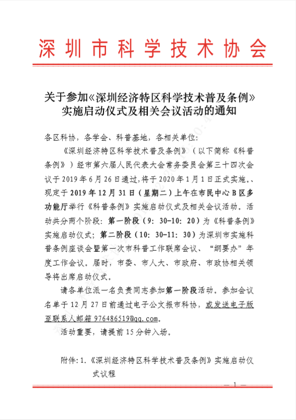 關于參加《深圳經(jīng)濟特區(qū)科學技術普及條例》? ?實施啟動儀式及相關會議活動的通知