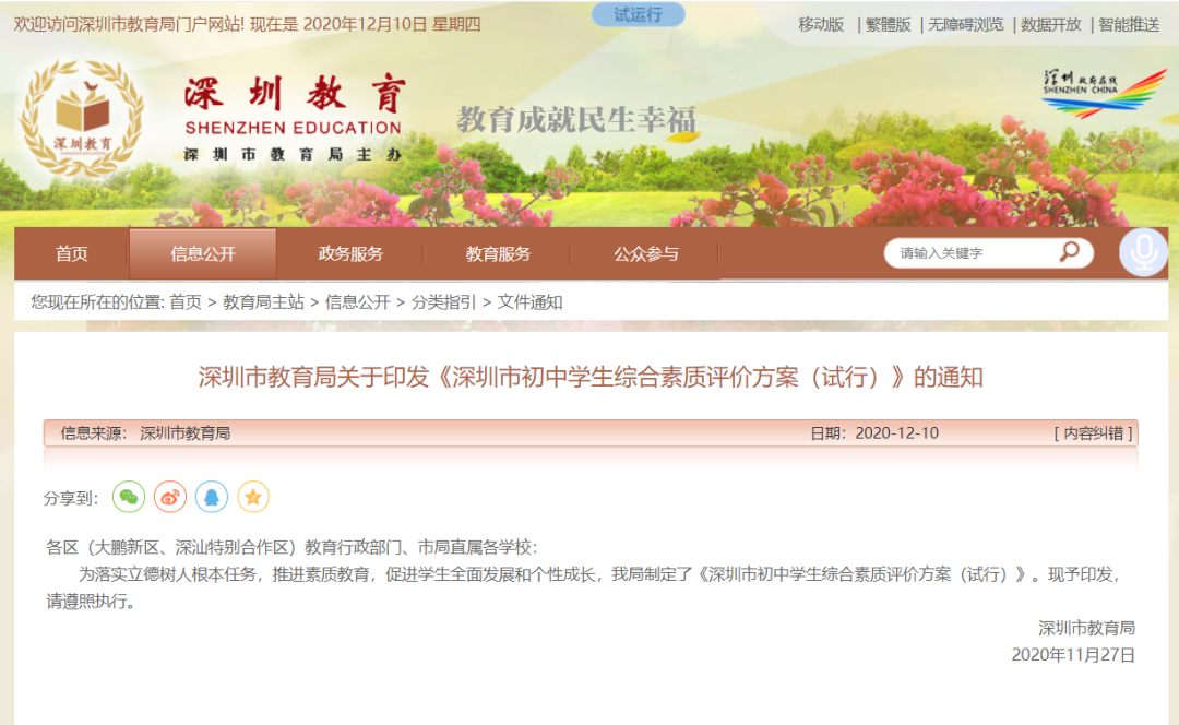 2、“綜評檔案”不作為高中階段學(xué)校招生考試成績相同情況下的錄取比較條件。2018年印發(fā)的《高中階段學(xué)校考試招生制度改革的實(shí)施意見》中關(guān)于綜合素質(zhì)評價(jià)的規(guī)定,與本方案不一致的,以本方案為準(zhǔn)。