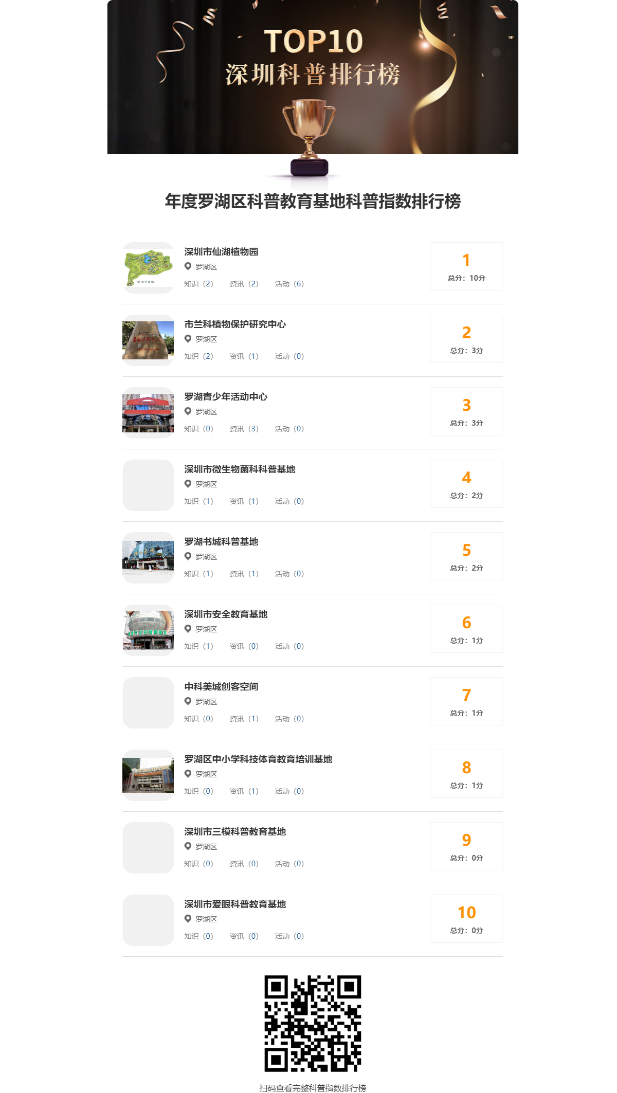 7月份羅湖區(qū)科普教育基地科普指數(shù)排行榜