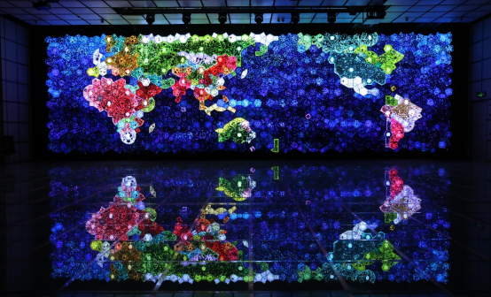IBC世界寶石墻,由我司聯(lián)合中央美術學院歷時三年傾力打造,匯聚世界各國地區(qū)最具代表性的寶石,涵蓋各類水晶、碧璽、坦桑石、翡翠、和田玉等近170余種寶石原石,寶石總重達15噸。寶石墻總面積為139.85平方米,以世界地圖為靈感,將200萬顆寶石通過不同材質與切割工藝結合,純手工釘制,打造成獨一無二的寶石作品,作品上的每一顆寶石,均來自“一帶一路”沿線30多個國家與地區(qū),在收集的過程當中不斷與各國及各礦區(qū)建立聯(lián)系,從而搭建起一個珠寶文化、科技、貿(mào)易、交流的舞臺,向世界傳播好中國聲音。
