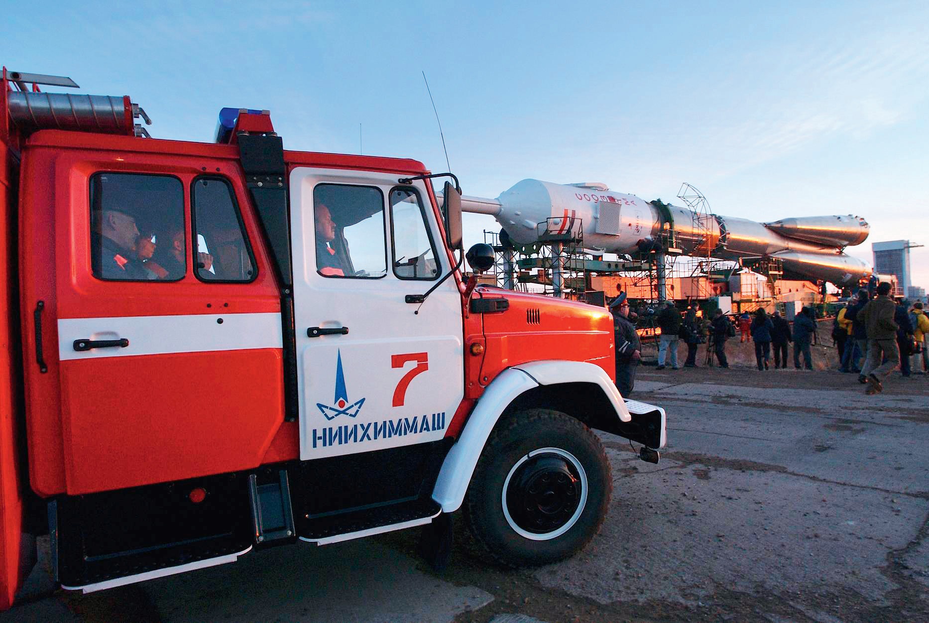 聯(lián)盟TMA-4飛船發(fā)射前,消防車在火箭附近保駕護(hù)航
