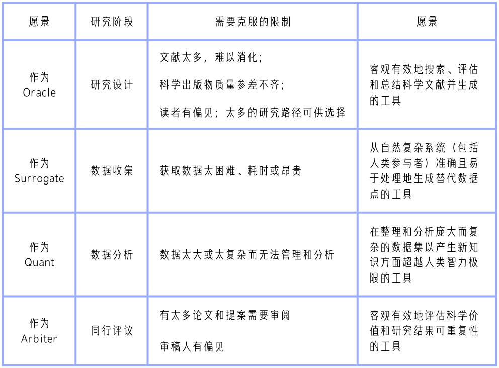 表|科學研究中的 AI 愿景。通過分析最近有關 AI 改善跨科學學科知識生產(chǎn)潛力的出版物,得出以上四種類型。納入的論文要么使用“AI”這個通用短語,要么提到 AI 概念之下的特定方法,最常見的是機器學習、自然語言處理和大型語言模型。該表總結了愿景如何響應不同的研究階段,以及對科學能力和效率的感知限制。