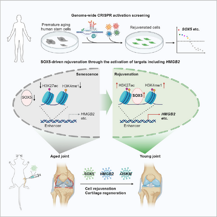 2023年10月12日,中國科學(xué)院動物研究所劉光慧研究組、曲靜研究組,聯(lián)合中國科學(xué)院北京基因組研究所張維綺課題組、任捷課題組,在《細(xì)胞-干細(xì)胞》(Cell Stem Cell)上,在線發(fā)表了題為Genome-wide CRISPR activation screening in senescent cells reveals SOX5 as a driver and therapeutic target of rejuvenation的研究論文。在論文中,作者報道了新發(fā)現(xiàn)的SOX5基因,可以讓細(xì)胞在不改變細(xì)胞身份(攜帶自身“記憶”)的前提下發(fā)生細(xì)胞更生,讓已衰老的細(xì)胞重新年輕活化。
