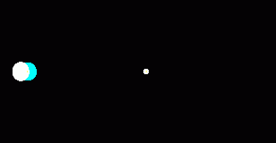 圖片正中存在一個(gè)引力透鏡(透鏡本體位于圖片正中,未在圖片中標(biāo)注),引力透鏡背后的點(diǎn)光源(青色圓)從引力透鏡背后橫穿時(shí),我們只能看到被扭曲的像,也就是白色部分。圖片來源:wikipedia