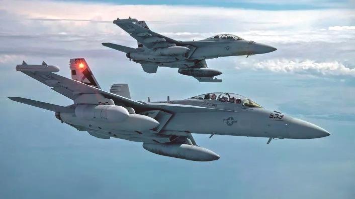 圖為兩架“咆哮者”電子戰(zhàn)飛機(jī)編隊(duì)飛行,飛機(jī)攜帶下一代中頻干擾吊艙AN/ALQ-249。