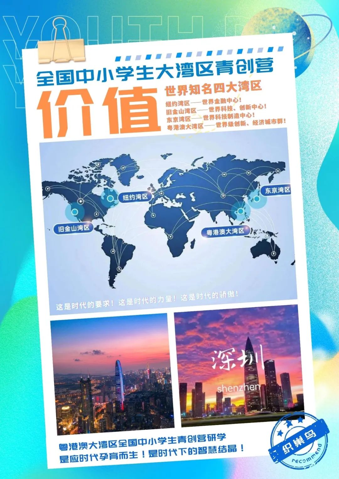 ? 青創(chuàng)營——“世界灣區(qū)企業(yè)芯?青年創(chuàng)新砥礪行”全國中小學(xué)生暑期大灣區(qū)青創(chuàng)營(以下簡稱:大灣區(qū)青創(chuàng)營),是由深圳織巢鳥人才管理有限公司(深商會(huì)會(huì)員企業(yè))聯(lián)合深圳商業(yè)聯(lián)合會(huì)(簡稱:深商會(huì))及下設(shè)服務(wù)組織:粵港澳大灣區(qū)數(shù)字經(jīng)濟(jì)產(chǎn)業(yè)聯(lián)盟、深商AI智能機(jī)器人產(chǎn)業(yè)聯(lián)盟等共同打造,依托深圳上千家優(yōu)質(zhì)創(chuàng)新企業(yè)資源,通過“深商風(fēng)云人物”、“改革開放30年影響深圳30個(gè)經(jīng)濟(jì)人物”、“影響中國的深商領(lǐng)袖”等優(yōu)秀企業(yè)家的成功模式和傳奇故事,對(duì)8-18歲(三年級(jí)以上)青少年身心特征、認(rèn)知規(guī)律、創(chuàng)新思維、學(xué)業(yè)發(fā)展等特征專門研發(fā)的一套優(yōu)質(zhì)創(chuàng)新思維集中研學(xué)方案,以“認(rèn)知突破、創(chuàng)新成長”別具特色的研學(xué)模式,實(shí)地探訪世界知名企業(yè)和世界知名學(xué)府,與優(yōu)秀企業(yè)家對(duì)話,感受創(chuàng)新力量、人才智慧。