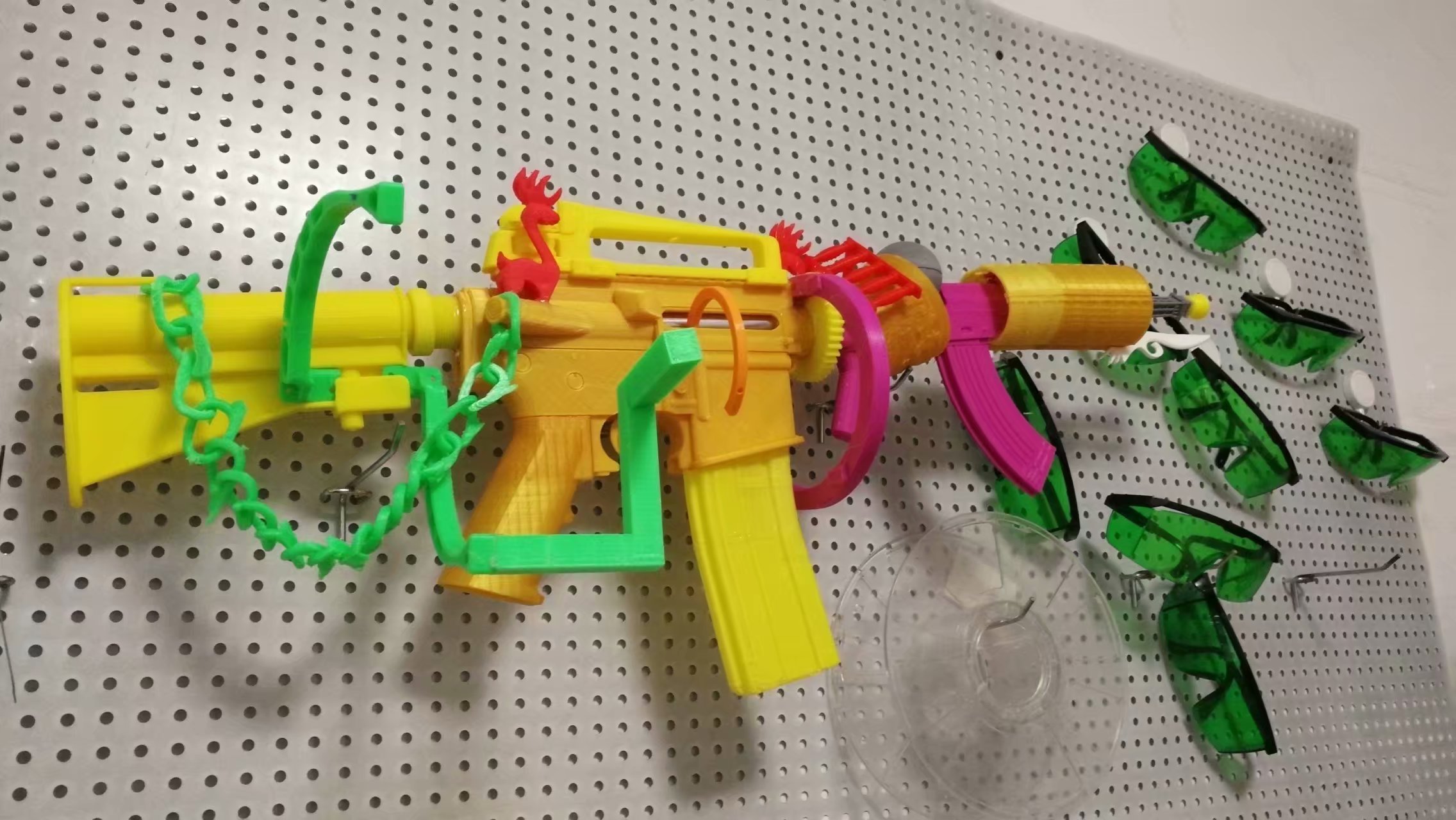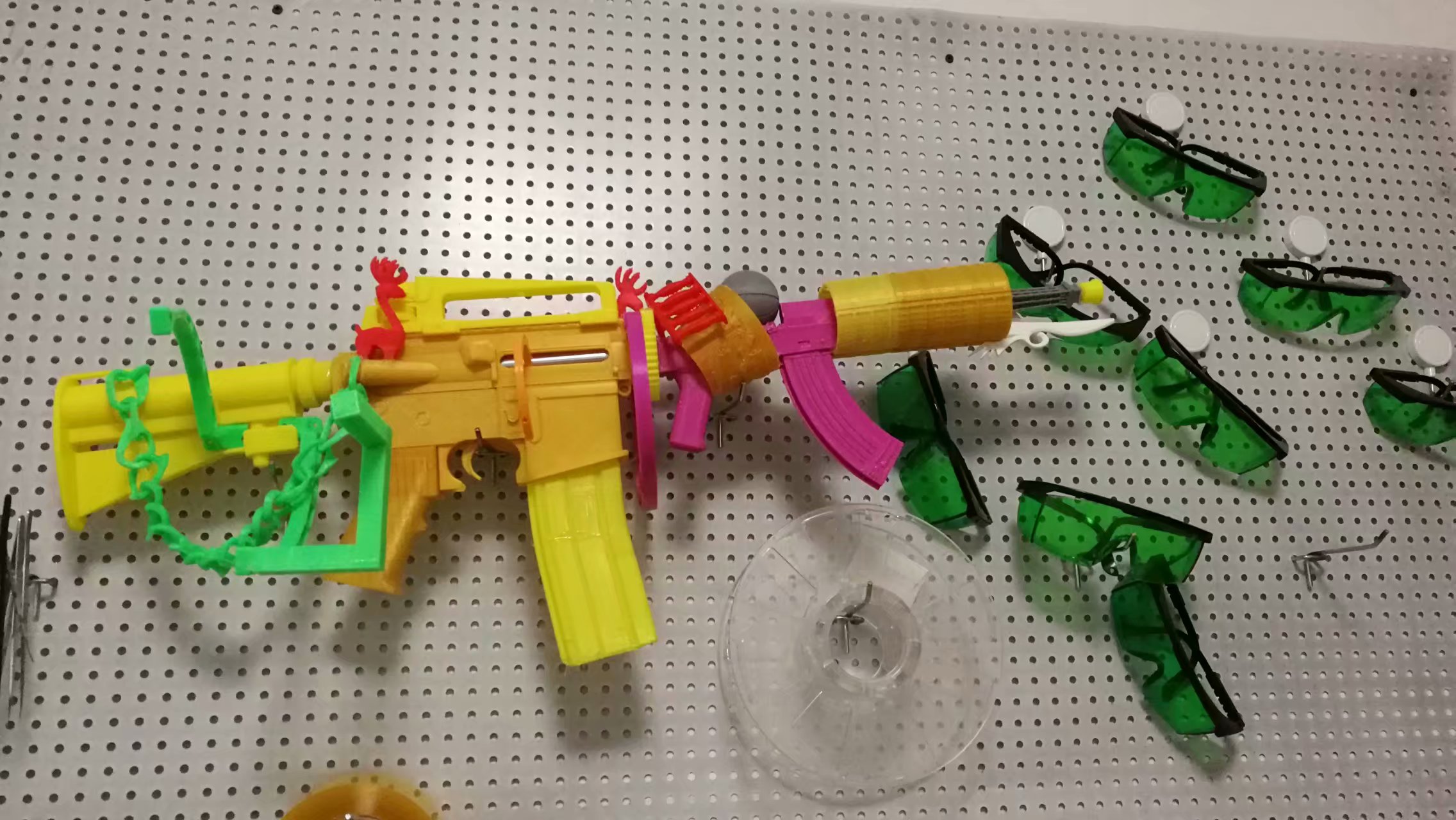 這次我想分享的就是我和我的學(xué)生利用3D打印失敗的半成品組裝了一把槍,集結(jié)了AK47、M416、沙漠之鷹各槍械的機(jī)械設(shè)計(jì)外觀,同時(shí)我們一起天馬行空的賜予它無限的功能暢想未來槍械的設(shè)計(jì)理念、概念,還給這把槍去了個(gè)名字叫做“未來之槍”!