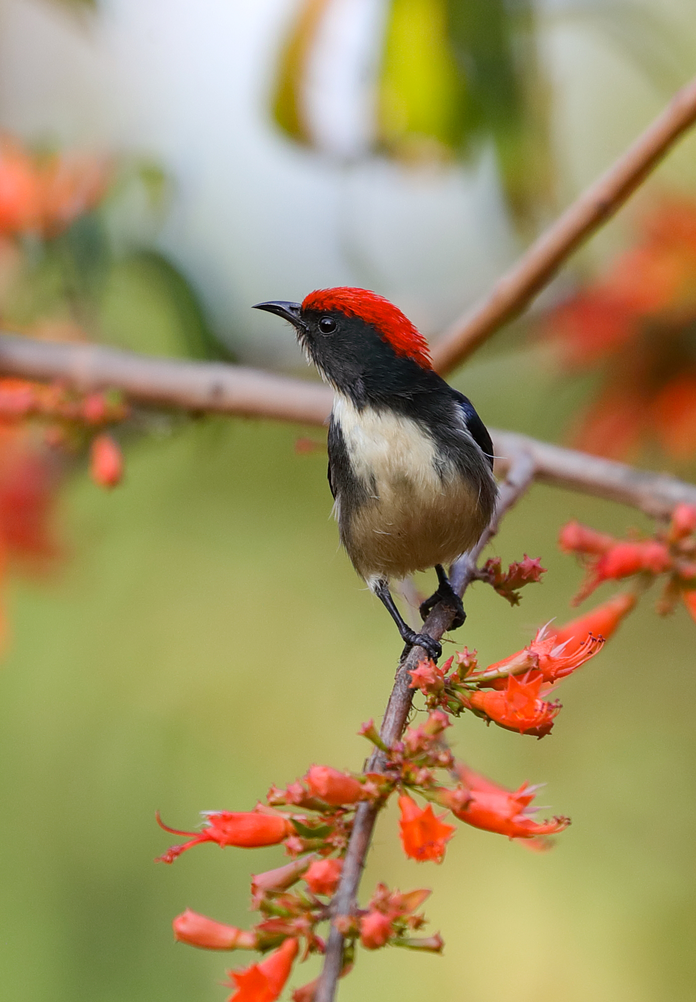 此作品拍攝于仙湖植物園,鳥名:朱背啄花鳥,它的特征是:從頭頂到后背有一條紅色的標記,非常醒目