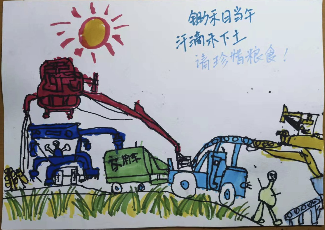 農(nóng)民們?cè)诹胰障拢脵C(jī)器收割稻谷,再變成谷粒,最后制成面粉。羅翊 翠北實(shí)驗(yàn)小學(xué)一(1)班