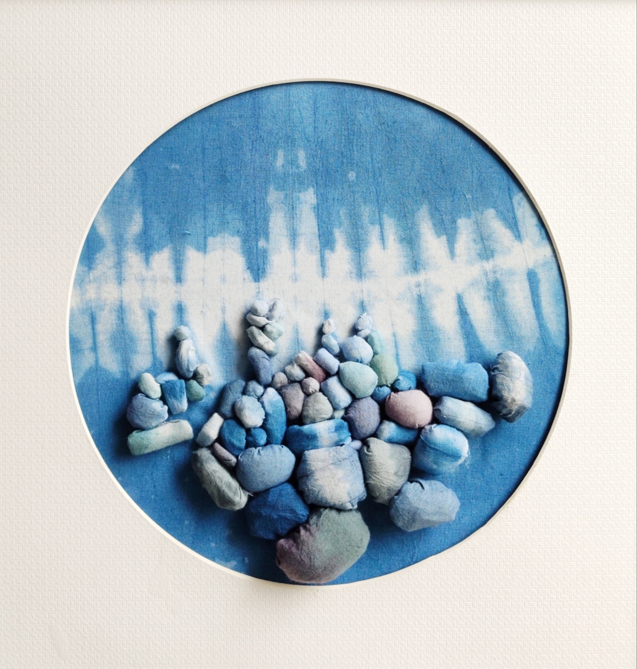 把面料進(jìn)行有規(guī)律與無規(guī)律捆扎。捆扎的越緊呈現(xiàn)出的圖案越多,顏色的層次更加分明。這一步是決定最終成品效果的關(guān)鍵步驟。