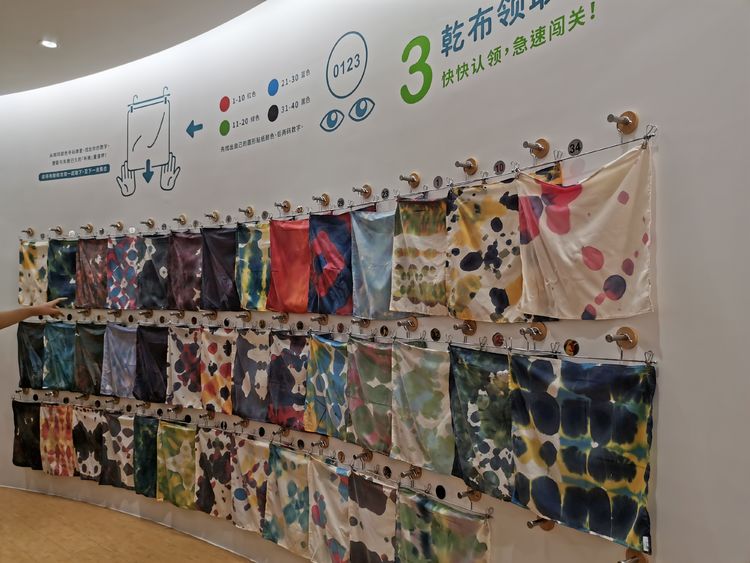 大家跟隨者科普導(dǎo)師的腳步,觀看了導(dǎo)演區(qū)會(huì)變色的“感溫油墨”;親手觸摸了棉花、羊毛和蠶絲;看導(dǎo)師示范操作紡織機(jī);進(jìn)行觸摸布料小游戲;參觀布料抵抗力實(shí)驗(yàn)測(cè)試;親自體驗(yàn)滴染,制作專屬花紋染布;和布偶互動(dòng);學(xué)習(xí)扎小布揪。