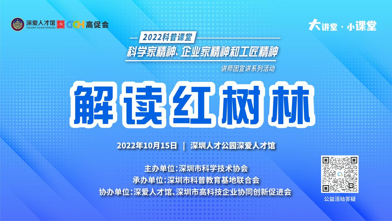2022年10月15日下午,“2022科普課堂”—科學(xué)家精神、企業(yè)家精神和工匠精神講師團(tuán)基層宣講活動(dòng)走進(jìn)深圳人才公園深愛(ài)人才館,為市民奉獻(xiàn)了一場(chǎng)視聽(tīng)盛宴。本次活動(dòng)由深圳市科學(xué)技術(shù)協(xié)會(huì)主辦、深圳市科普教育基地聯(lián)合會(huì)承辦。旨在向廣大青少年宣傳紅樹(shù)林知識(shí),提高自然保護(hù)意識(shí),喚醒大家對(duì)紅樹(shù)林的珍愛(ài)和保護(hù)之心。 ?