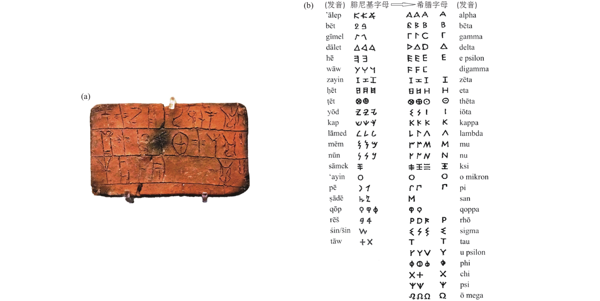 圖2 古代希臘地區(qū)的文字:(a)泥板上的邁錫尼線性文字B[希][1];(b)基于腓尼基字母經(jīng)改造和演變形成的希臘字母[2,13]