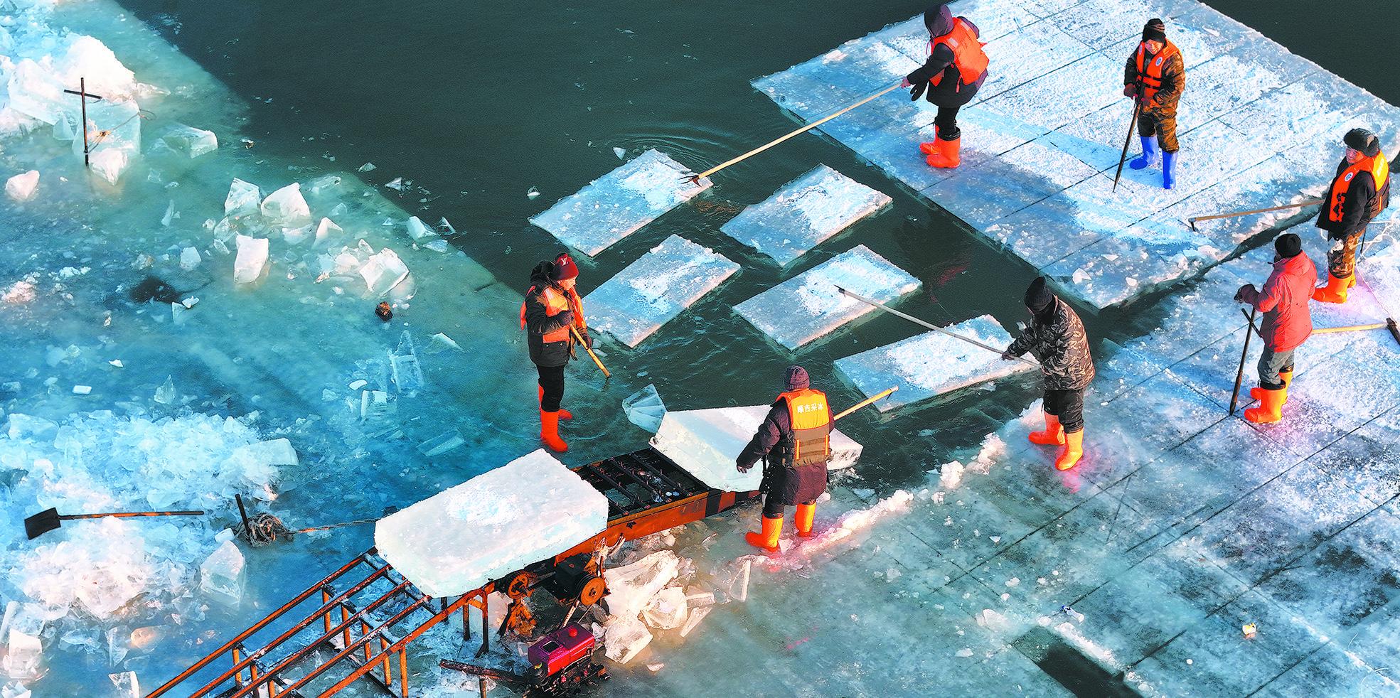 蜿蜒流淌的松花江,在氣溫驟降的寒冬里,放慢了奔流的腳步,寬闊的江面上凝固起厚厚冰層。這是大自然最好的饋贈,也是哈爾濱被譽為“冰城”的原因之一。每年“大雪”節(jié)氣過后,當冰層長大到30厘米時,松花江便迎來繁忙的采冰季。采冰是一項精細的工作,根據(jù)用冰的規(guī)格,富有經(jīng)驗的采冰人員會在冰層上按照長1.6米、寬約0.8米的尺寸畫出開冰線,用冰鋸將冰層切割成棋盤格一樣的方塊,由采冰工人用冰镩子沿著縫隙將冰塊一個個分開。這些每個重約700斤的冰塊,將通過傳送帶和叉車轉乘運冰車到用冰現(xiàn)場。
