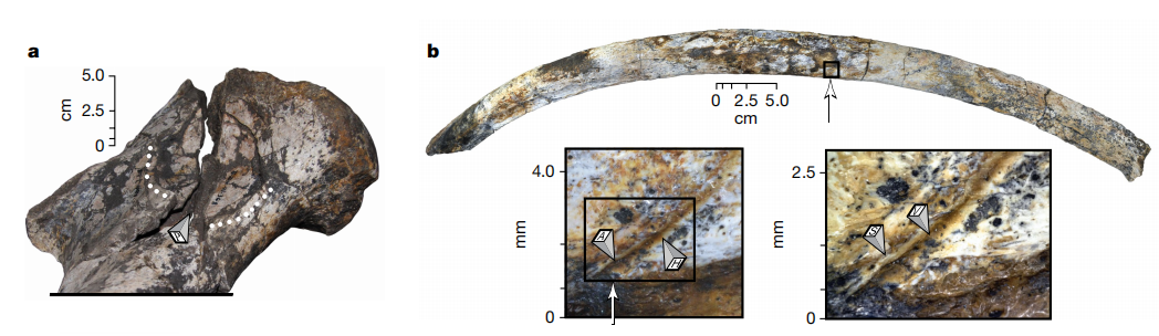 在俄羅斯北冰洋的科特爾尼島,科學(xué)家發(fā)現(xiàn)了一具猛犸象骨骼,根據(jù)這具骨骼上的人為切割痕跡和殘留的矛頭,可以推測(cè)古人類獵殺并食用猛犸象的場(chǎng)景。在新墨西哥州,考古學(xué)家在猛犸象和其幼崽的骨骼上發(fā)現(xiàn)了由鈍器造成的骨折和刺孔,同樣呈現(xiàn)出明顯的被屠宰痕跡。種種跡象表明,古人類獵食猛犸象確有其事。