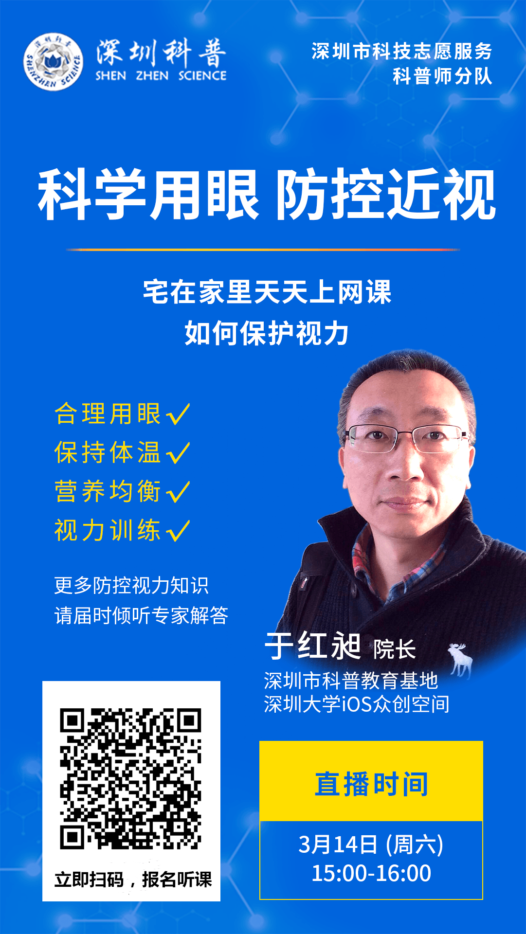 這個(gè)周末,深圳市科普教育基地聯(lián)合會(huì)的會(huì)員單位——深圳大學(xué)IOS眾創(chuàng)空間于紅昶院長(zhǎng),來(lái)給大家在線(xiàn)講解如何“科學(xué)用眼,防控近視”。從2月中旬開(kāi)始,于紅昶院長(zhǎng)已經(jīng)受邀為幾十所中小學(xué)的網(wǎng)課,做了講座哦~