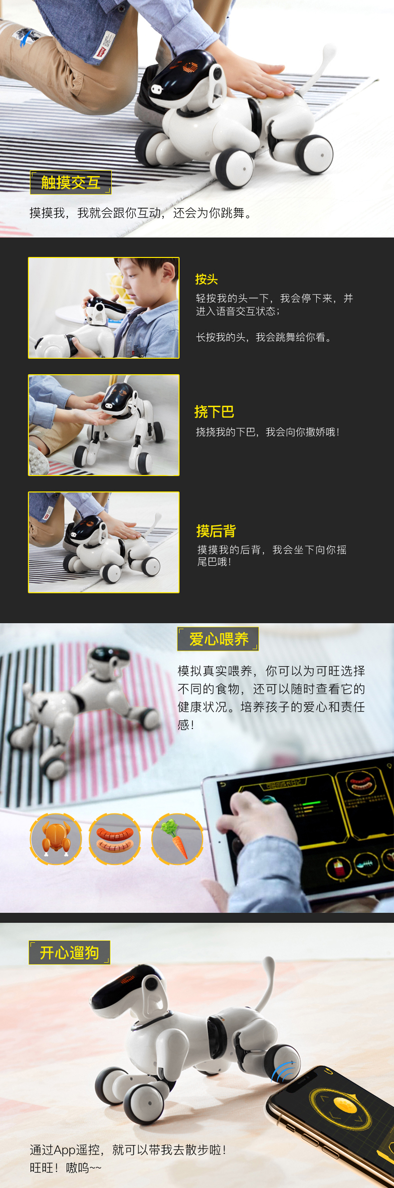 是一款搭載了尖端人工智能與舵機(jī)技術(shù)的仿生機(jī)器狗,它能識(shí)別語音指令,快速完成仿生動(dòng)作并表達(dá)自己的喜怒哀樂;通過App控制,還可以進(jìn)行智能編程、愛心喂養(yǎng)、開心遛豬、音舞特技、多機(jī)表演等功能互動(dòng)。