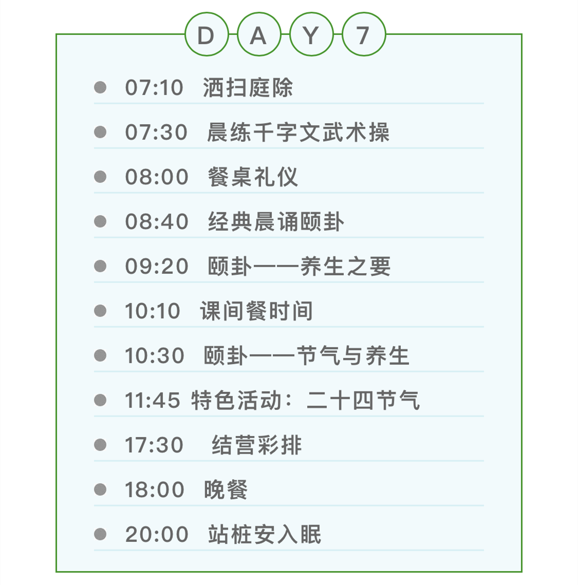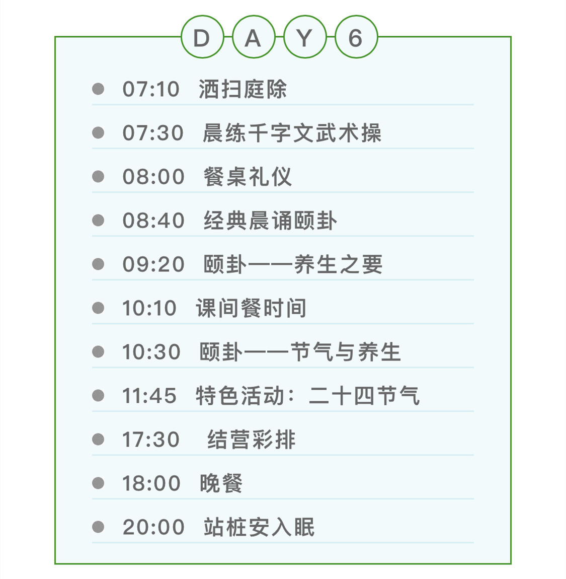 七天,“學(xué)做人”主題:懂得惜福,學(xué)會禮儀,蒙以養(yǎng)正,孝親感恩,奉獻(xiàn)愛心,環(huán)保我責(zé),展示成長。