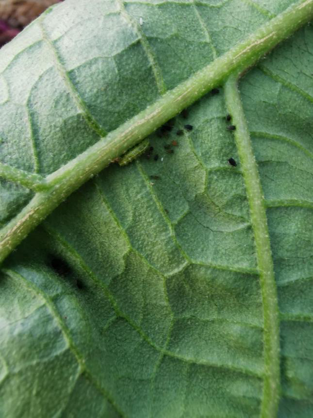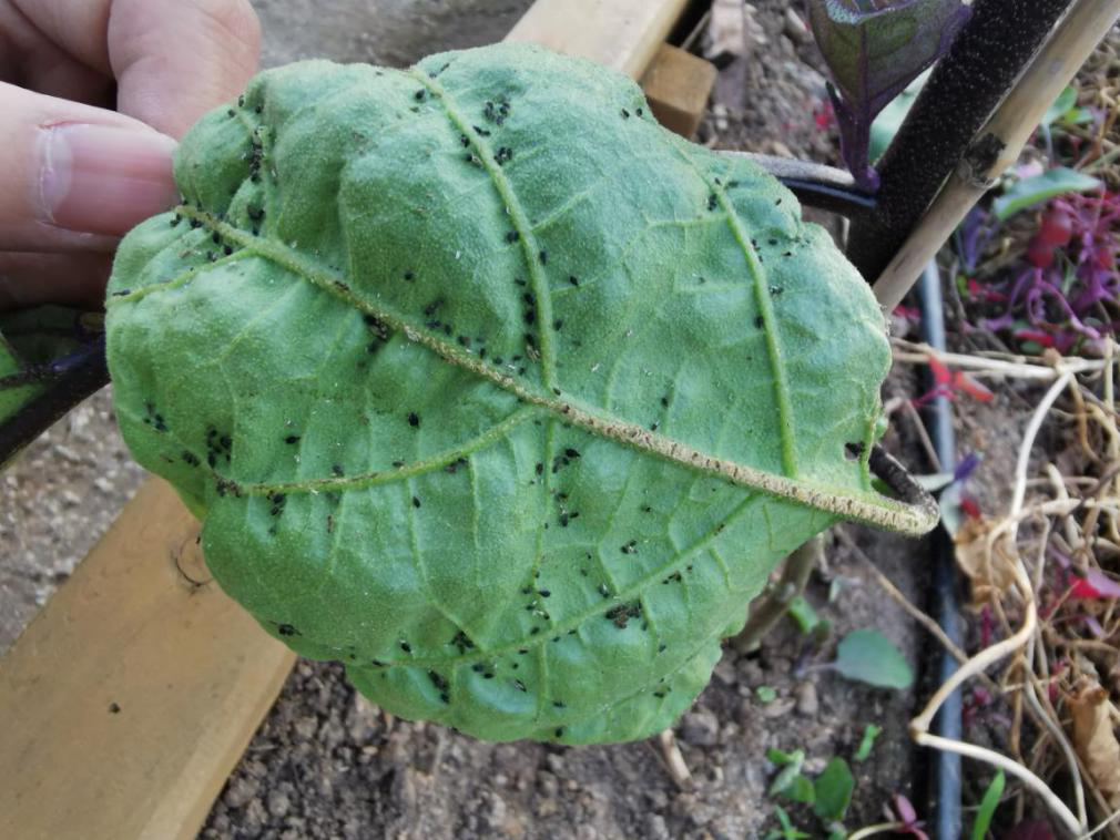其實(shí),并不需要打藥!只要菜園的生態(tài)好,會(huì)出現(xiàn)很多種類的天敵來共同消滅蚜蟲。我們來仔細(xì)觀察一下這些茄子葉片背后的蚜蟲堆,看看有沒有發(fā)現(xiàn)什么好東西!